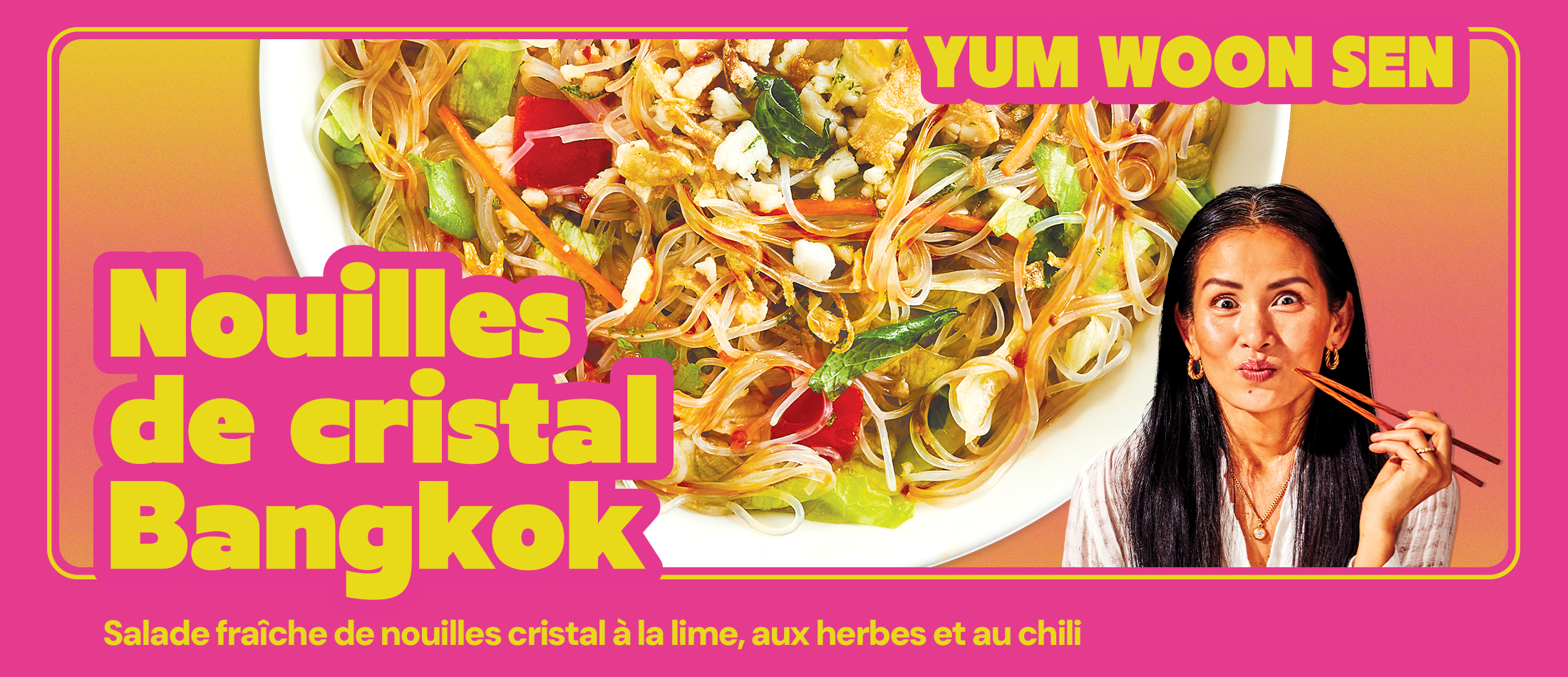 Une salade thaïlandaise vivifiante et rafraîchissante composée de nouilles de cristal, de légumes croquants, d’herbes fraîches et de poulet haché, le tout assaisonné de notre vinaigrette Yum Woon Sen.