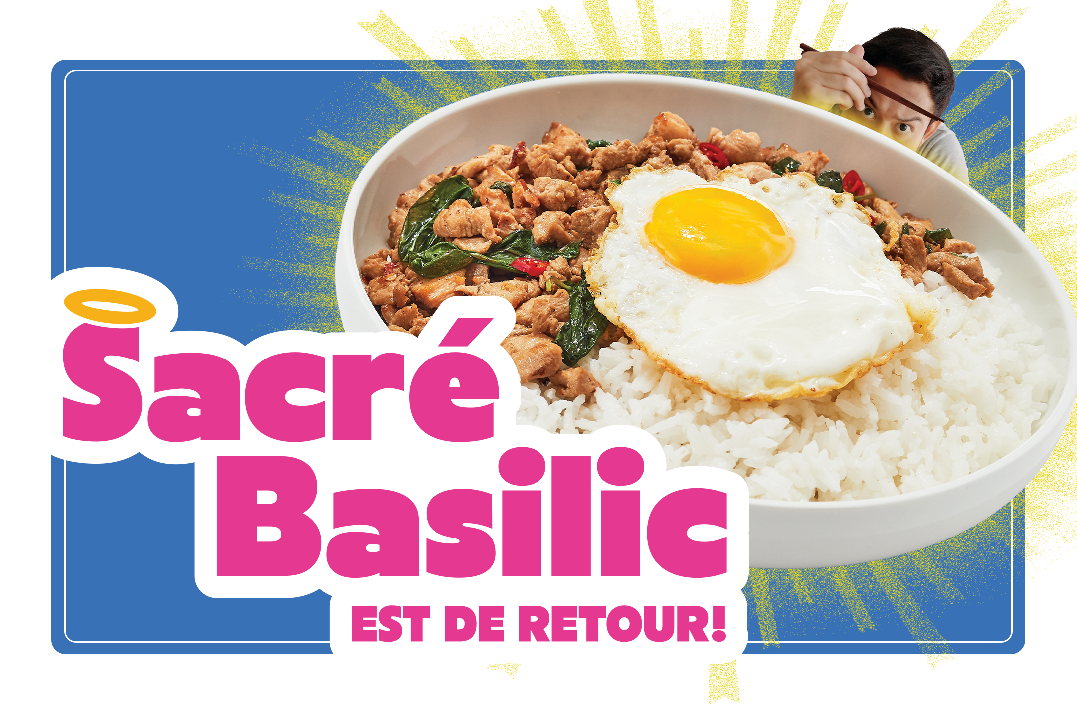 Sacré Basilic Un authentique sauté au basilic thaï garni d’un œuf frit croustillant et désormais accompagné de tiges de brocoli coupées en dés. En savoir plus »